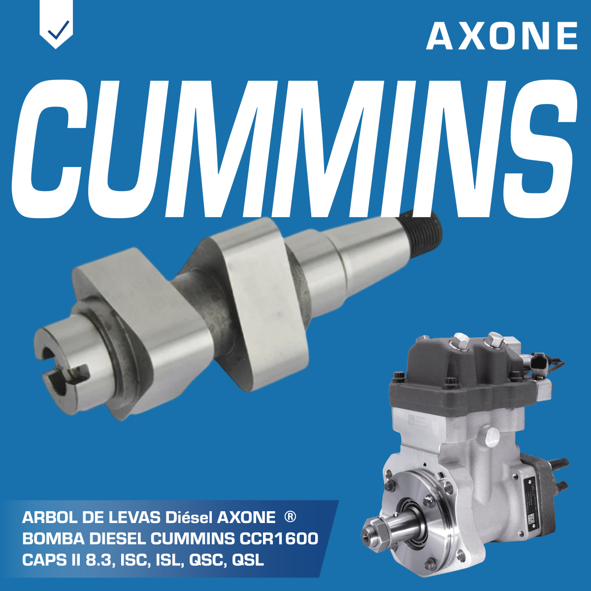Árbol de levas S3160062 para bomba diésel Cummins CCR1600 CAPS II, compatible con motores 8.3, ISC, ISL, QSC y QSL, asegura sincronización precisa, durabilidad y desempeño confiable como alternativa económica a repuestos originales, con 90 días de garantía respaldada por AXONE.