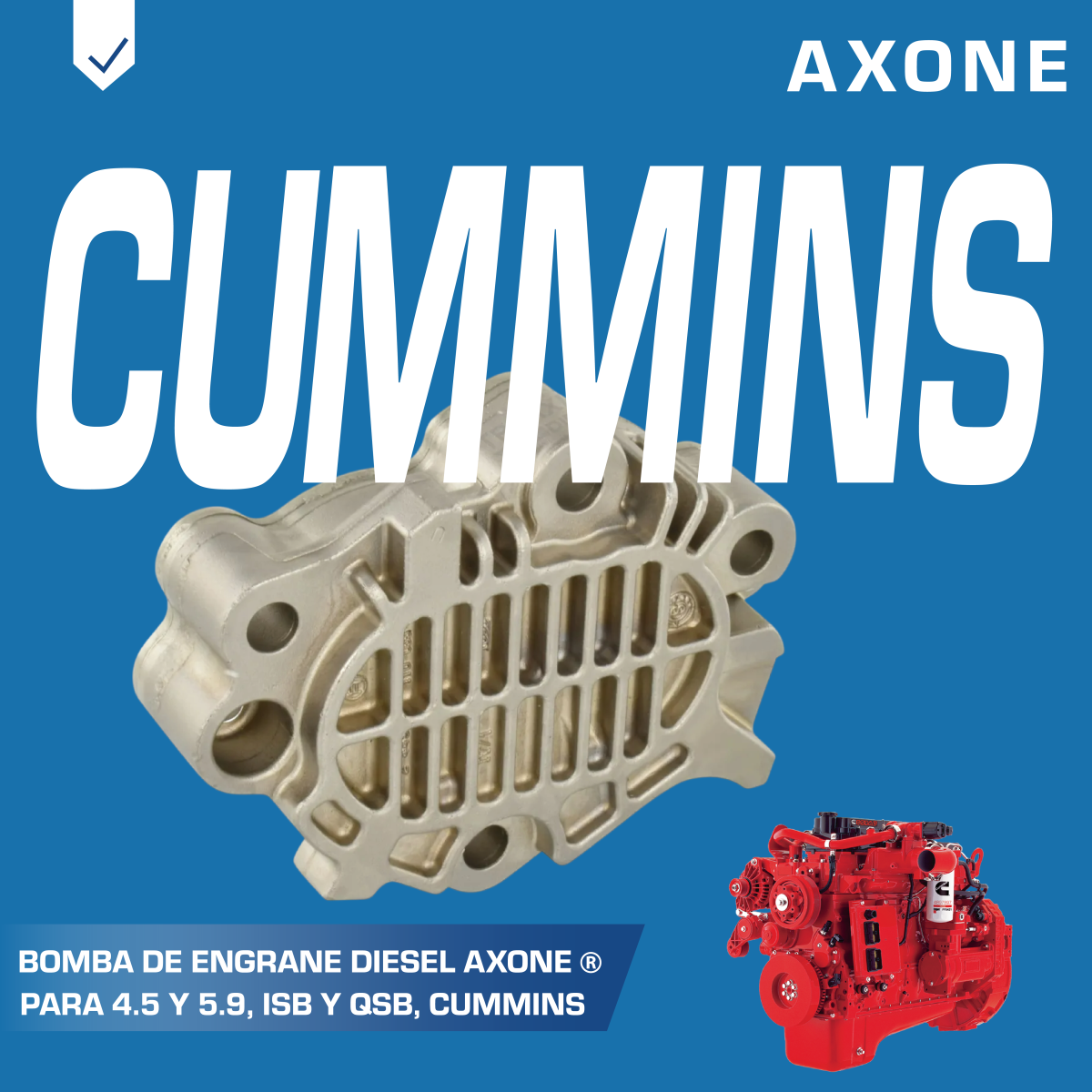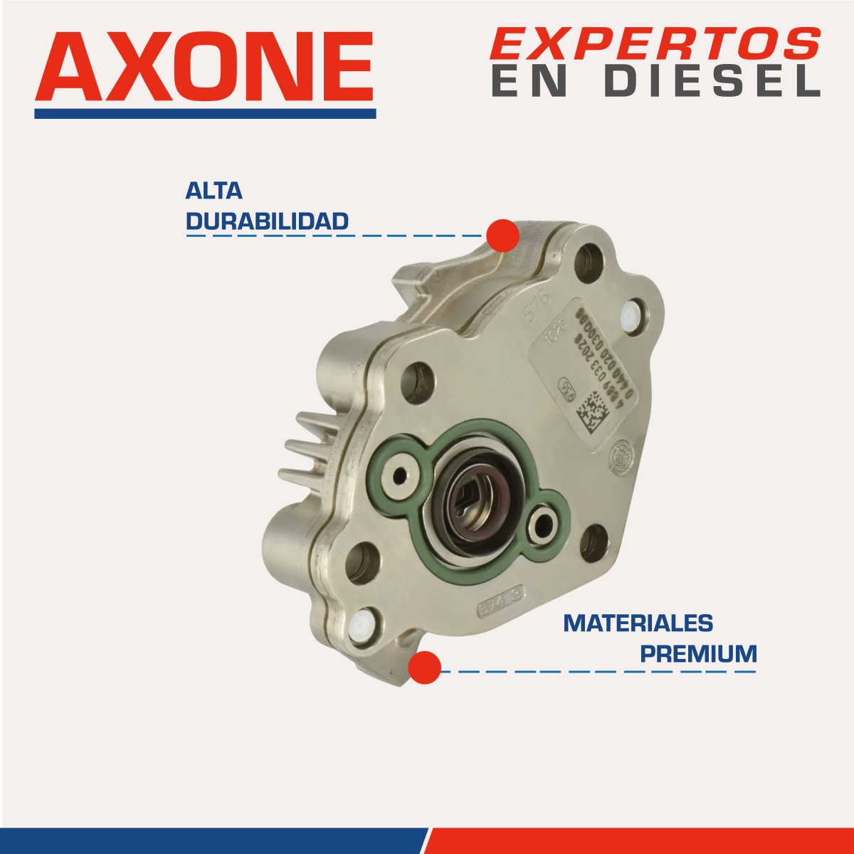 Bomba de engrane 0440020030 diésel Bosch, compatible con motores Cummins 4.5 y 5.9 ISB y QSB, garantiza suministro estable y confiable de combustible como alternativa económica a repuestos originales, 90 días de garantía respaldada por AXONE.