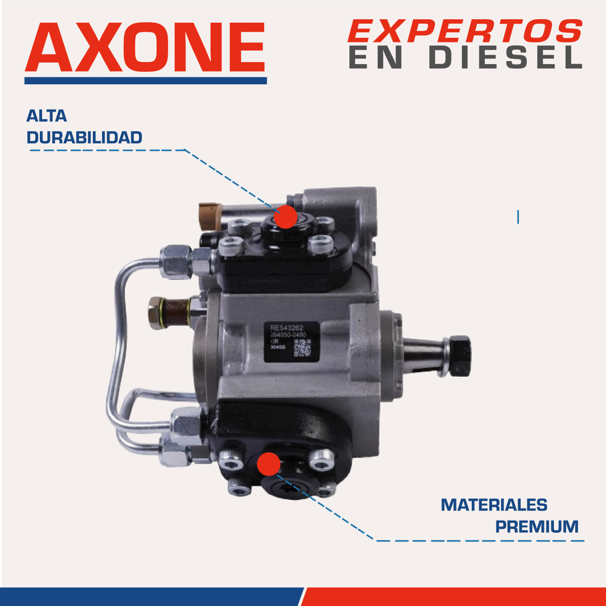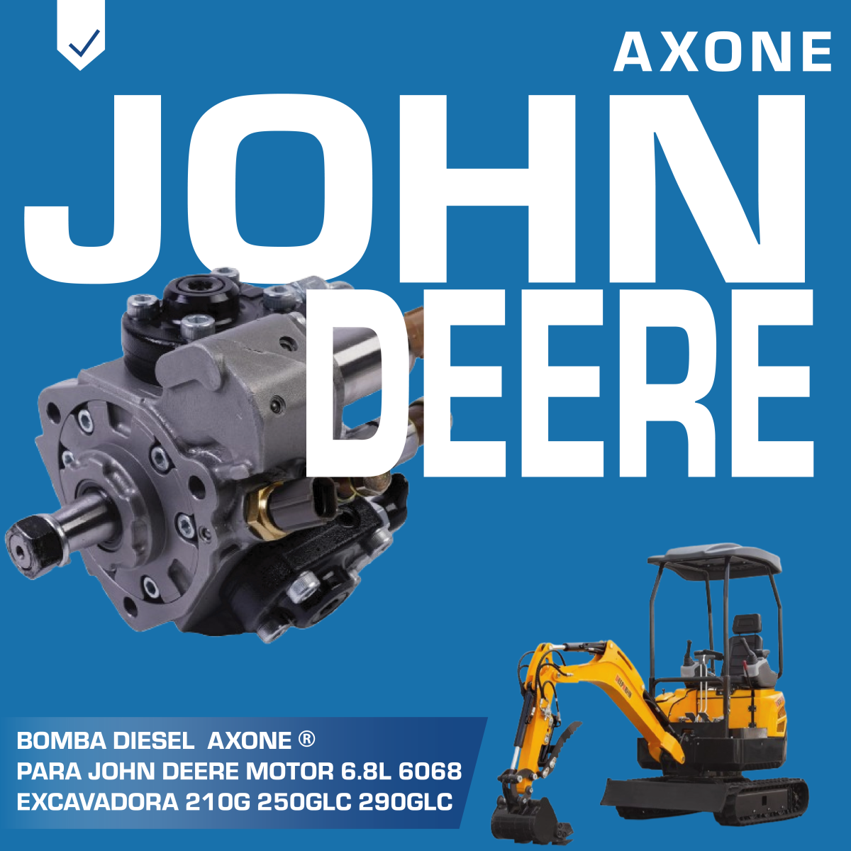 Bomba diésel 294050-0480 Denso CR HP4, compatible con motor John Deere 6.8L 6068 en excavadoras 210G, 250GLC y 290GLC, asegura suministro estable, alta presión y rendimiento confiable como alternativa económica a repuestos originales, con 90 días de garantía respaldada por AXONE.