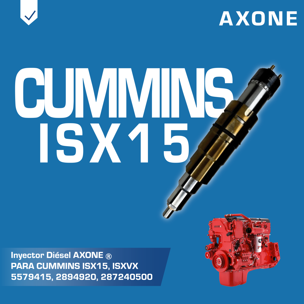 Inyector diésel AXONE 2872405AX REMAN. . El inyector diésel 2872405AX es compatible con motores Cummins ISX15 y QSX15. Garantiza una inyección precisa y confiable que optimiza el rendimiento, la potencia y la eficiencia de combustible en aplicaciones de trabajo pesado. bajo estrictos estándares de calidad, ofrece durabilidad y desempeño estable, siendo una alternativa segura y económica frente a repuestos originales. . Incluye 90 días de garantía por defecto de fabricació