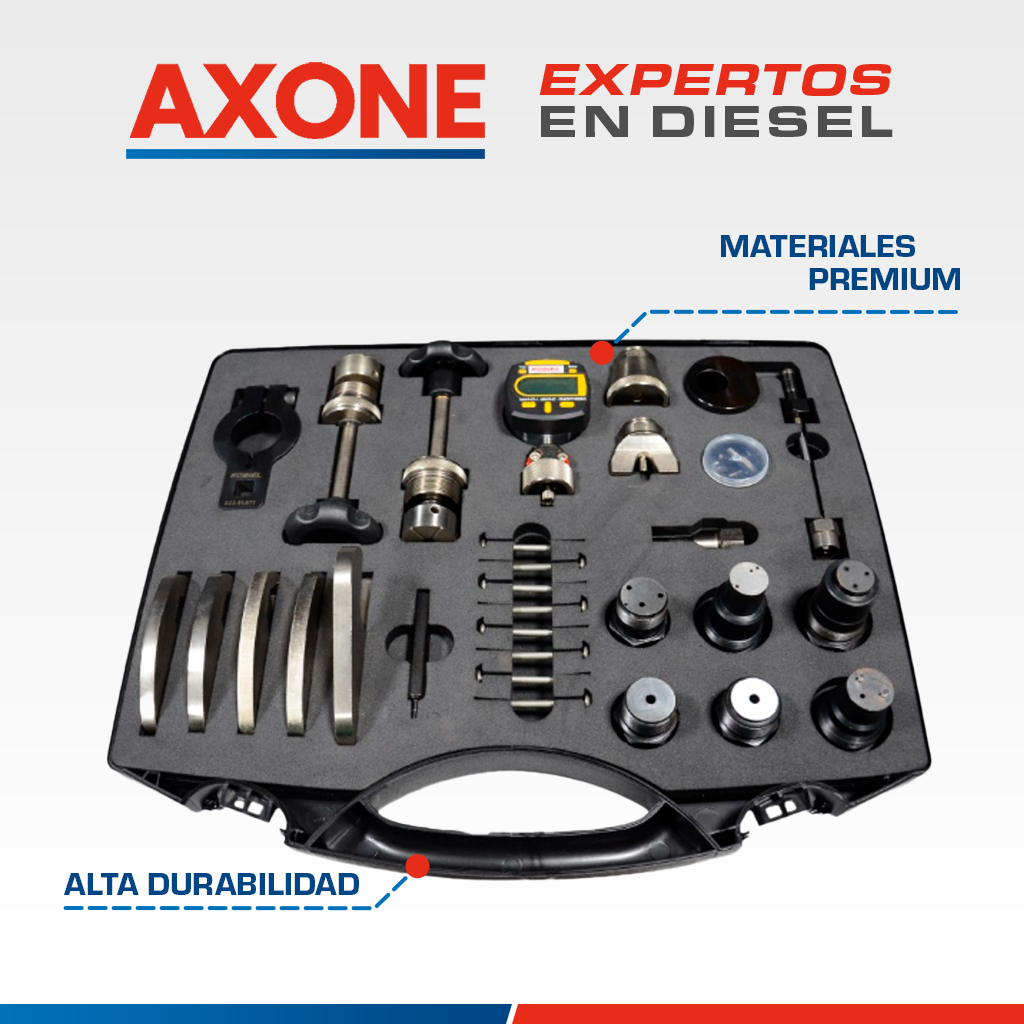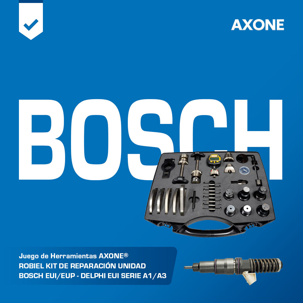 Juego de herramienta 3235013 para unidades Bosch y Delphi versión R1, diseñado para montaje y reparación precisa, asegura ajustes confiables, prolonga la vida útil de los componentes y optimiza el desempeño como alternativa económica a equipos originales, con 90 días de garantía respaldada por AXONE.