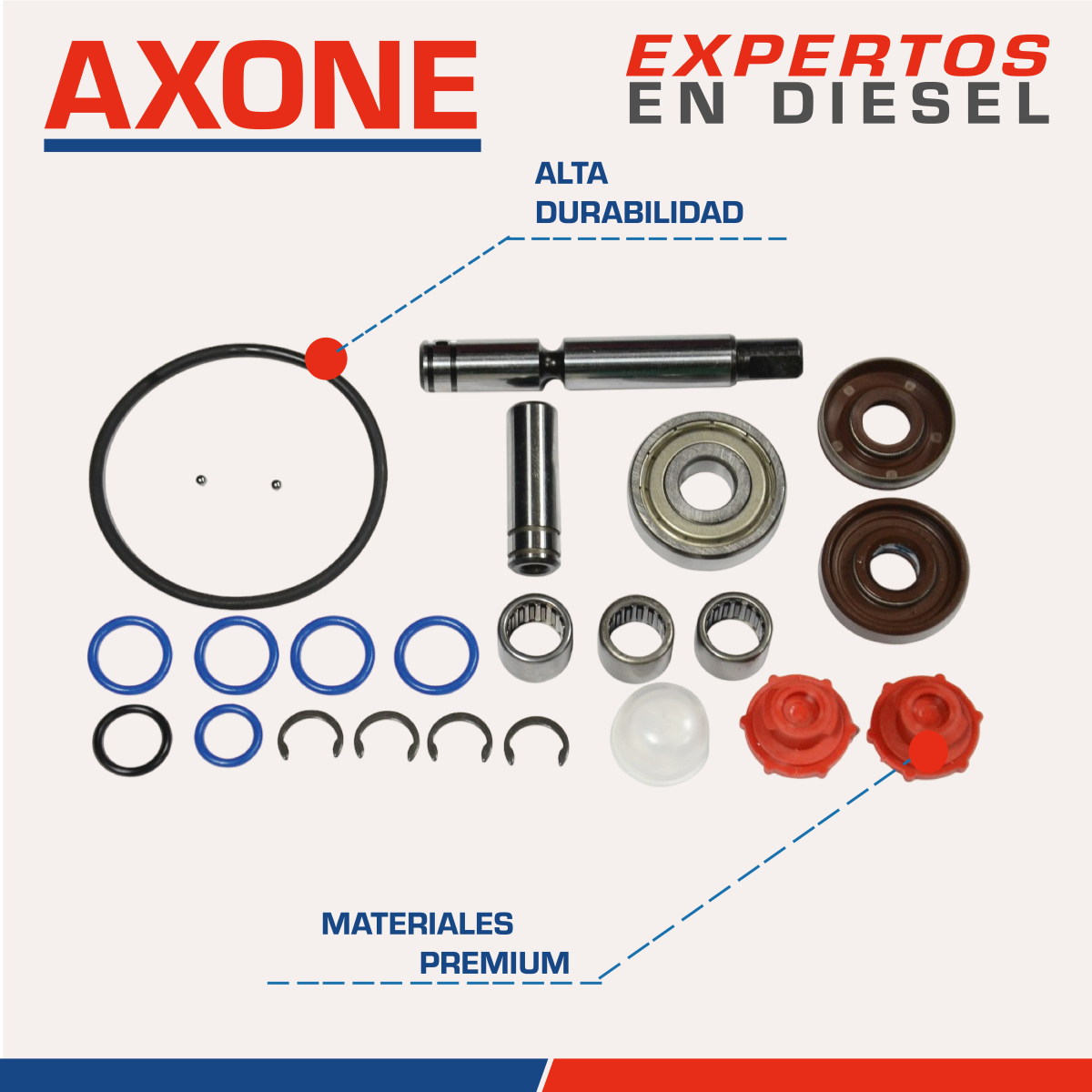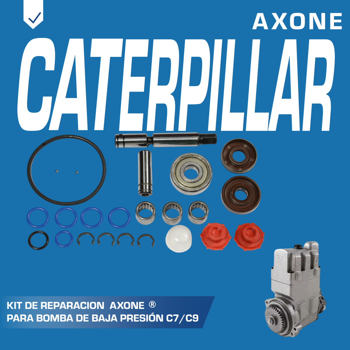 Kit de reparación 41060357 bomba de baja presión C7/C9, diseñado para restaurar el correcto funcionamiento del sistema de alimentación de combustible, garantizando eficiencia, sellado confiable y durabilidad. Es una alternativa económica y de alta calidad frente a los repuestos originales, desarrollada por especialistas y respaldada con 90 días de garantía AXONE.