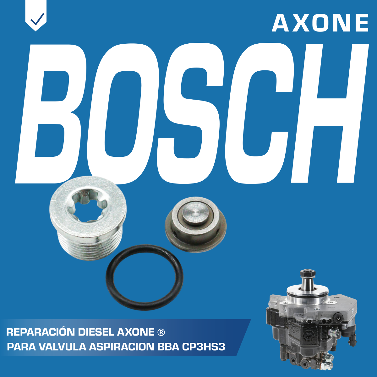 Reparación 41020049 de válvula de aspiración para bomba diésel Bosch CP3HS3, asegura sellado confiable, rendimiento estable y prolonga la vida útil del sistema como alternativa económica a repuestos originales, 90 días de garantía respaldada por AXONE.